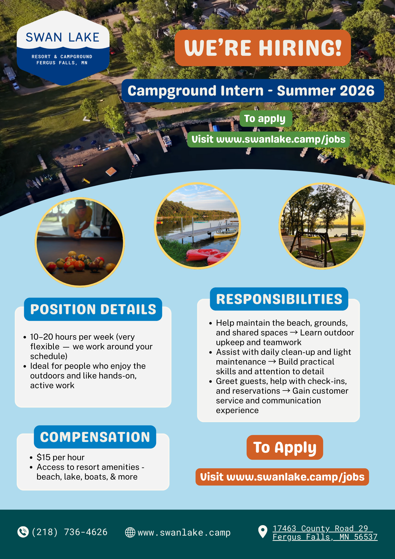 Swan Lake Resort & Campground is seeking a motivated, enthusiastic Intern to support day-to-day campground operations throughout the season.
